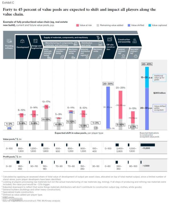 有些公司受影响更大。软件供应商预计将显著增加其增值贡献,尽管是从价值链 1%到 2%的小增量。此外,预计会有很大一部分价值从建筑工地转移到场外预制设施。相比之下,除非总承包商和专业承包商将自己重新定位为执行能力卓越的公司,否则可能会面临很大的下滑。基本的工程设计以及材料的分销和物流可能会面临大量商品化和自动化风险。