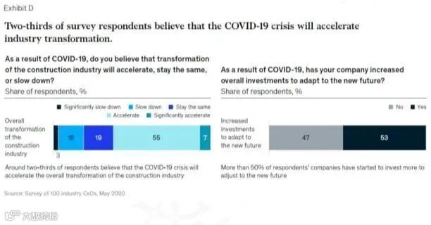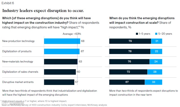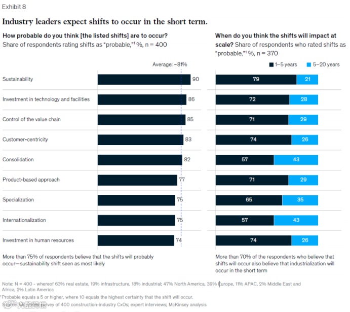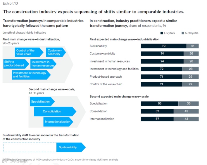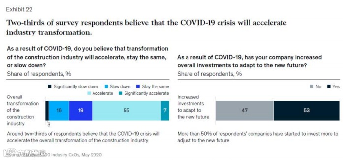 建筑业的全面转型可能需要数十年的时间,但是这一过程已经开始。我们的调查显示,行业领导者在很大程度上认可这一点,本报告中概述的变化可能在未来五到十年内大规模发生,并且新冠疫情将加速变化。
