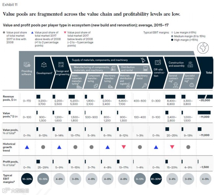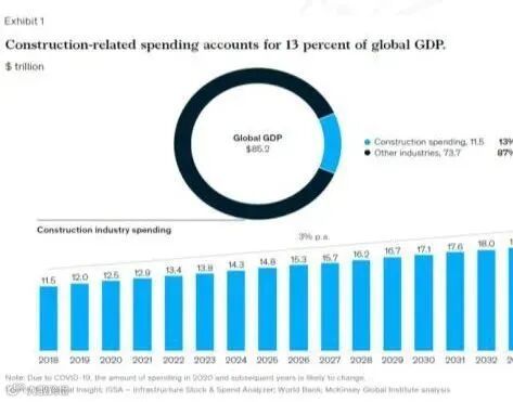 ——建筑业是世界上最大的产业,即使在危机之外,建筑业也表现不佳。建筑的产业链占全球GDP的13%,但在过去的二十年中,建筑业的生产率仅以每年 1%的速度缓慢增长。尽管建筑行业存在明显的经营风险,工期和造价超支是常态,但息税前利润(EBIT )也仅为5%左右。