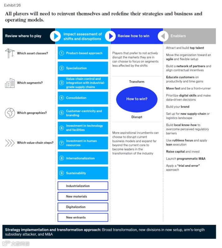 为了有效应对行业性颠覆,建筑产业的所有相关公司应该改变他们的战略、商业模式和经营模式。他们需要提拔能者上任才能在新的世界中生存,并需要选择自己的转型方式。有些细分行业会受到更大的影响,但每个细分行业都会有自己的竞争路径。