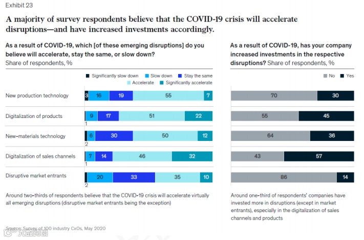 鉴于新冠疫情是在本报告出版过程中发生的,因此我们在2020年5月初进行了补充调查,以帮助我们了解危机对加速颠覆和转型的潜在影响。受访者包括来自同一样本的100名决策者(其所处公司在资产类别和地理位置以及整个价值链上的分布都相似),他们于2019 年11月和12月对第一次调查做出了回应。