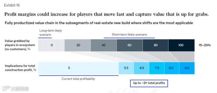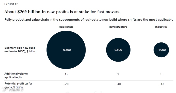 ——2650亿美元/年的利润池等待颠覆者到来。全球建筑产业价值链(增加值约11万亿美元,利润1.5万亿美元)会发生巨变。根据分资产类别进行的分析和专家访谈,即使当新冠疫情的经济影响减弱时,受到颠覆的细分市场也可能会有40%-45%的现有增加值处于风险之中,这些价值可能会转移,例如转为异地制造、消费者剩余或新的利润来源。如果建筑业者获取了这些转移价值,盈利能力可能翻倍,从 5%增至10%。在房地产、基础设施和工业结构等领域变革的规模和步伐以及适当的应对措施各不相同。迅速行动并设法在根本上超越竞争对手的玩家可以在 2650 亿美元的新增和转移利润中(现有利润中的 15%-20%会在体系之内重新分配)抢占最大份额,并且估值更类似于硅谷初创公司而非传统建筑公司。