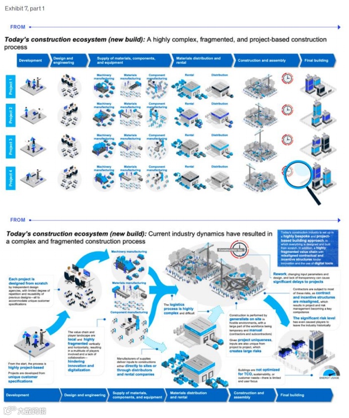 客户希望为具有独特功能的定制项目付款,并且建造结构需要针对其所处的自然环境进行设计。但此类项目的可重复性和标准化程度有限,需要公司在整个价值链上进行协调。这一动态是建筑行业复杂性和低生产率增长的主要原因。