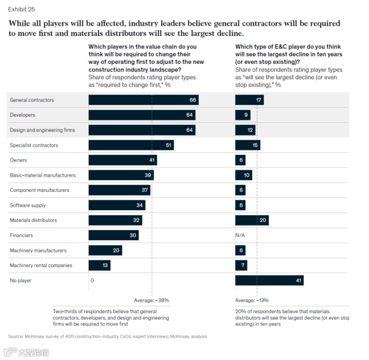 即便没有新冠疫情,长期而言这四个细分行业也将面临最大的下滑:材料分销商、综合总承包、专业分包商以及工程设计公司。这些参与者可能面临商品化和价值份额下降的问题。此外,受访者认为,总承包商将会率先进行转型(图表 25)。