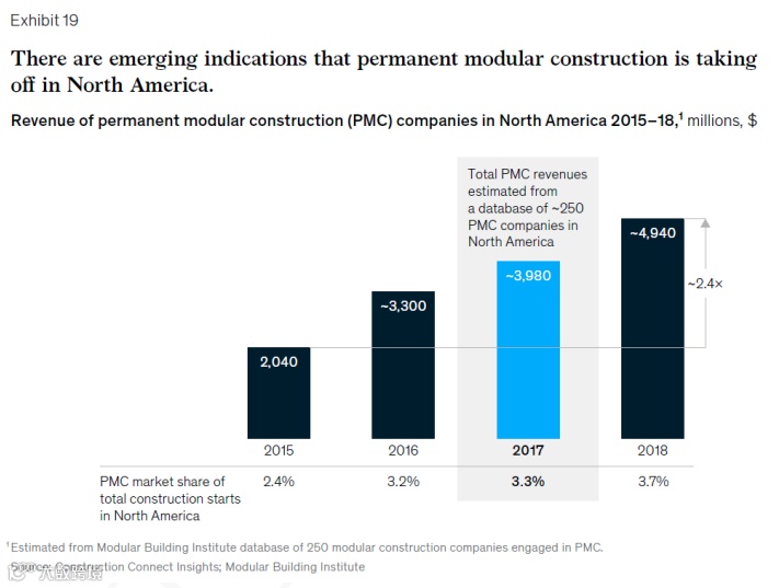 以产品为基础的方法正日益受到重视。例如,在北美,在2015 至 2018 年间,永久模块化建设房地产项目的总市场份额增长了 51%,该部门的总收入增长了 2.4 倍(图表 19)。在英国和美国,模块化建筑约占酒店建设项目总数的 20%。