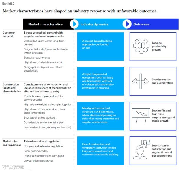 这些市场特征之下,今天的建筑业需要克服多种阻碍生产力和变革的力量:(具有独特性的定制项目的)可重复性和标准化程度有限;(本地市场结构和行业门槛低导致)碎片化(横向和纵向均是),大部分是规模经济有限的小公司;项目步骤繁多、责任分散化使得协调变得更加复杂,承包模式和激励机制错位;风险通常会在价值链内转移,而不是消除,参与者从索赔中获利而不是直接受益于优质的交付;高度不可预测性和周期性导致建筑公司依赖临时员工和分包商,从而影响了效率,限制了规模经济并降低输出质量和客户满意度。