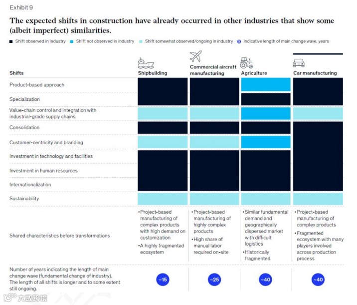建筑业不是第一个在整个价值链上遇到落后生产力和被破坏颠覆的行业。可以从其他行业身上汲取教训,这些行业具有相似的特征并曾遇到建筑业现在面临的挑战。我们分析了其中四个行业的变化:造船业、商用飞机制造业、农业和汽车制造业。所有这些变化都清晰可见,并且价值转移给那些能够最好地应对变化的人。生产技术的创新和新的工作方法启动了新进程。如今,在各个行业中,赢家都继续在技术上进行大量投资,其中很多都专注于数字化以及数据驱动的产品和服务。