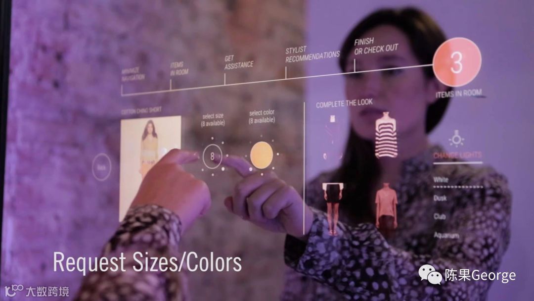 更衣室技术- Oak Labs开发的交互式触摸屏镜子,让购物者可以要求新物品,调整试衣间照明,并查看服装建议。镜子可以使用RFID技术感知购物者带入房间的产品,然后展示相关产品,将商品保存到购物者的在线帐户。Oak与包括Polo Ralph Lauren在内的零售商合作。