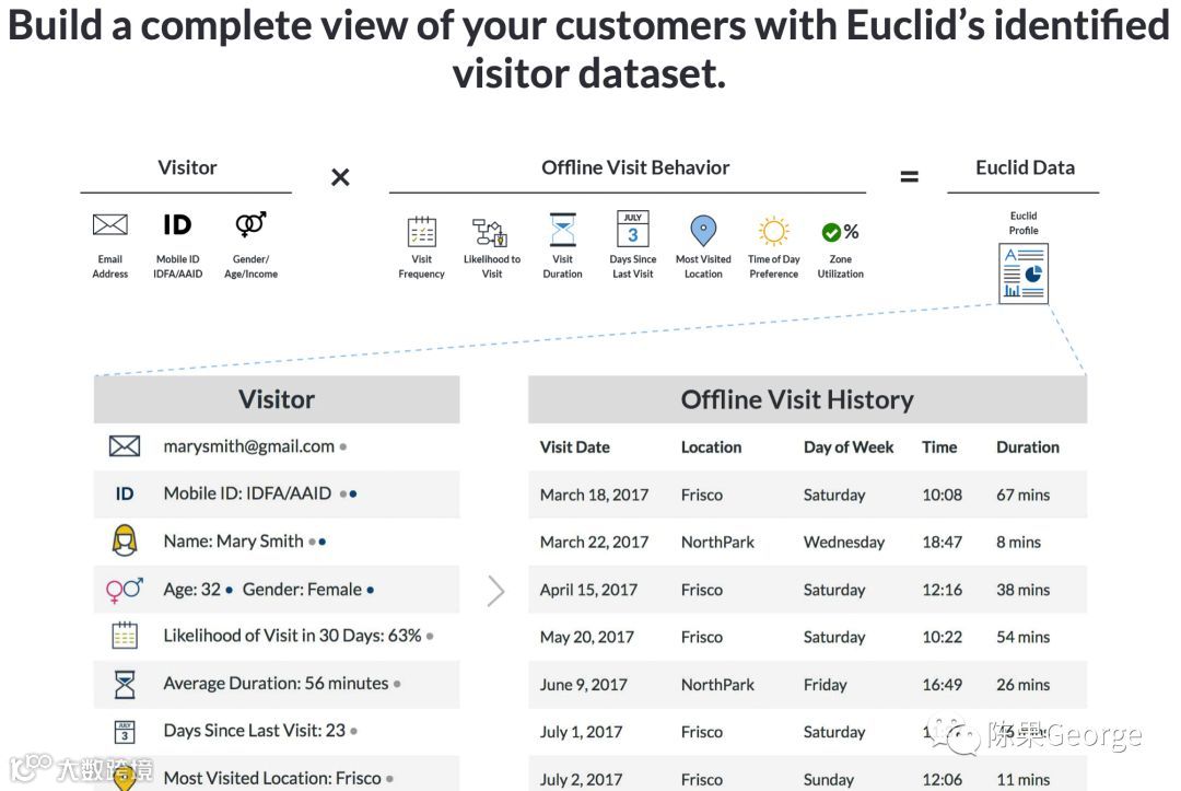 位置分析和邻域营销- 提供硬件和软件,以帮助商店跟踪访客。一些专注于内部分析的数据收集,例如商品采销跟踪,调整人员配备水平,监控促销等。例如,Euclid Analytics跟踪访问者(下图),以监控促销措施对到店人流的影响,并更好地了解人们的到店时间和特定货架通道。有些专注于在店内及附近向购物者进行营销。例如,Estimote感知到目标人群靠近时,会向用户的手机发送有关产品或促销的推送通知。RetailNext提供客流传感器,顾客路线图,移动营销等。