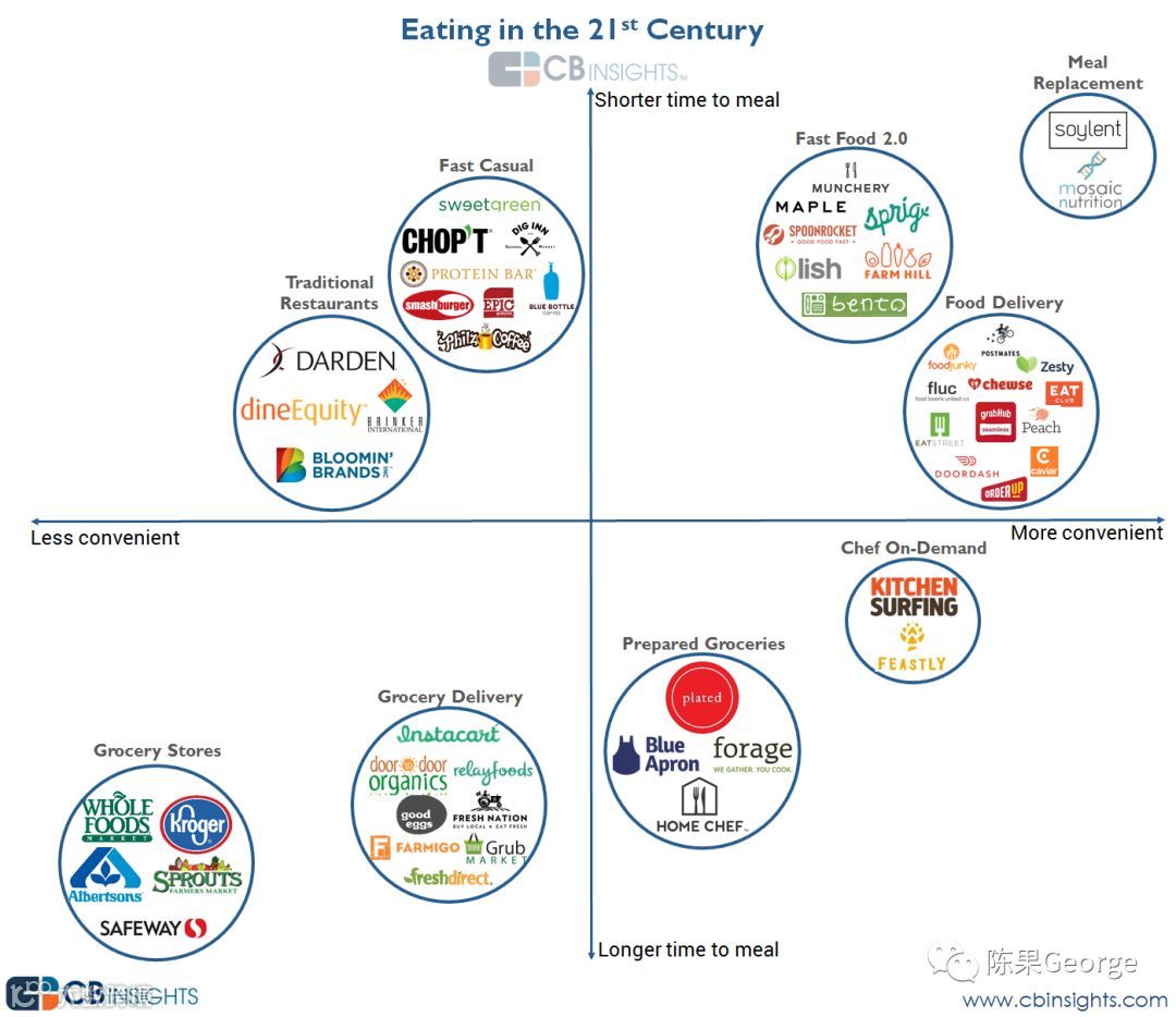 Soylent这样的膳食替代公司位于第一象限右上角,显示出方便和速度的结合。而大型的Darden餐厅(经营Olive Garden,Longhorn Steakhouse等),以及Sweetgreen这样的快速休闲餐厅则位于左上象限。