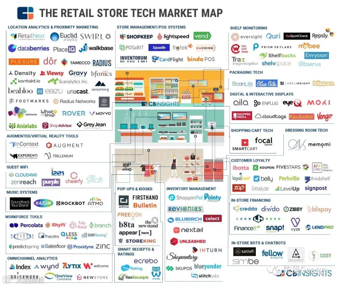 这些公司致力与实体零售企业的数字化,从码货上架机器人,到增强现实显示器,再到基于Wi-Fi的信标,收集购物者行为的数据。许多公司专注于通过基于云的软件和移动应用来优化现有商店运营,帮助零售商管理员工安排、移动支付、优惠券等。非常多的公司在做位置分析和近场营销,使用物联网硬件和智能手机来跟踪商店内购物者。将人工智能,增强/虚拟现实和机器人等前沿技术应用于零售,例如,InContext Solutions在虚拟现实中规划商店布局和陈列,而Satisfi利用IBM Watson的AI为零售商开发实时店内聊天机器人。应用这些技术的零售公司包括服装和奢侈品零售,杂货零售,百货商店以及餐馆等。