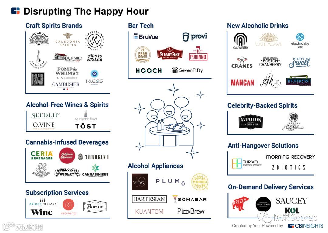 无论称之为欢乐时光,还是apéro,在工作之余和晚餐之前的几个小时是主要饮酒场合。创业公司进入手工烈酒、大麻饮料和无酒精饮料,为欢乐时光饮用者提供创新产品;订阅服务、外卖以及家用电器随时为用户提供喜欢的饮品。随着手工酒的发展趋势,Diageo,AB InBev和Pernod Ricard等传统大型酒类公司都开始投资新兴品牌;注重健康的消费者关注有酒精味道的无酒精饮料。