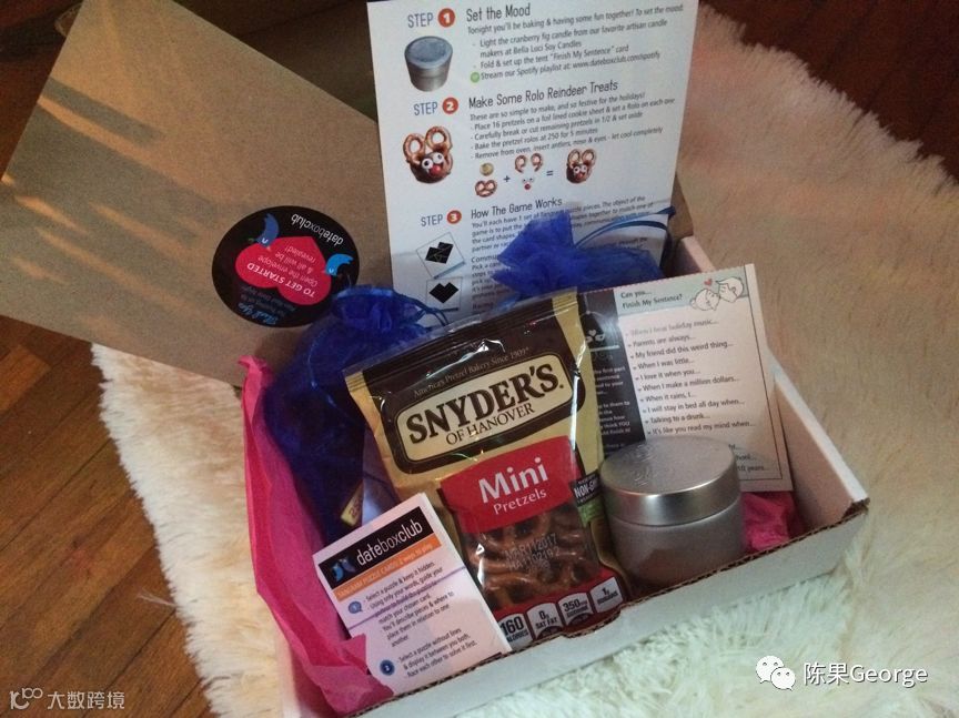 休闲- Loot Crate,订阅极客和游戏文化的东西。Datebox,每月向夫妇提供约会物品(下图),Cairn为户外运动爱好者提供包括能量棒、头灯和生火器等物品的盒子。