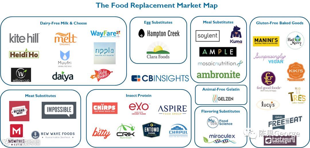 谷蛋白,肉类或乳制品替代品市场的增长受到人们对健康、环境和生活方式追求的驱动;另一个趋势是技术创新,食品制造商用替代食品来满足消费者需求,同时具有同样的味道和质地。实验室培养肉类的Impossible Foods是肉类替代者领导,该公司已融资1.83亿美元。下图还包括了多家孵化企业,包括Muufri,无动物牛奶; Miraculex,以植物为基础的糖替代品; Gelzen,制造无动物的食用明胶; Willow Cup,基于植物、无牛奶的乳制品。