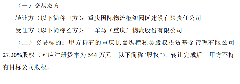 重庆国际物流枢纽园区建设有限责任公司(以下简称“国际物流枢纽公司”)拟通过重庆联合产权交易所公开挂牌转让其持有的重庆长嘉纵横私募股权投资基金管理有限公司(以下简称“长嘉纵横”、“目标公司”、“标的公司”)27.20%股权,但不转让前述股权享有的长嘉纵横未来可以获得的重庆渝物兴物流产业私募股权投资基金合伙企业(有限合伙)超额收益。三羊马(重庆)物流股份有限公司(以下简称“公司”)持有长嘉纵横 1.60%股权,系长嘉纵横参股股东。