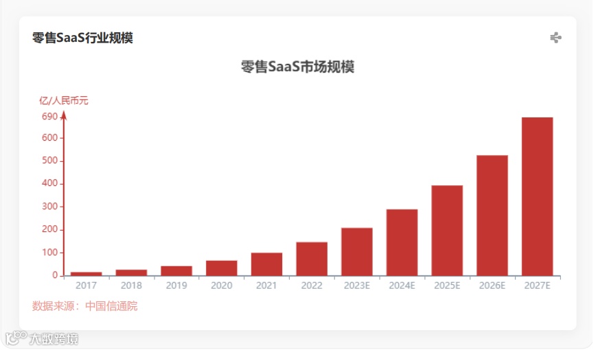 据该报告预测,零售SaaS的市场规模将于2027年达到689.91亿元,2023-2027年复合增长率为34.93%,前景广阔。