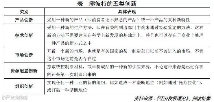 在熊彼特看来,创新包括五种情况,分别为产品创新、技术创新、市场创新、资源配置创新与组织创新,具体如下表: