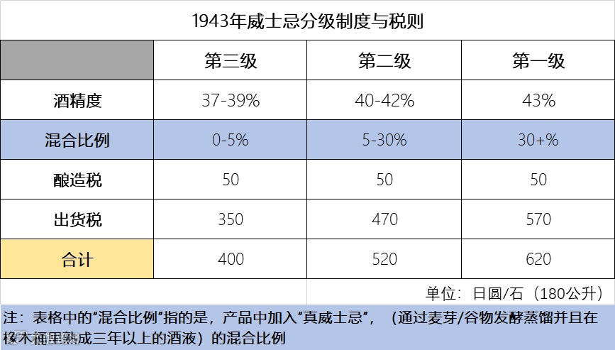 说到这里,不得不科普一下日本对于威士忌的税收法规。1943年,战时的日本政府在横加税收的同时,也推出了一套新体系-威士忌分级制度。
