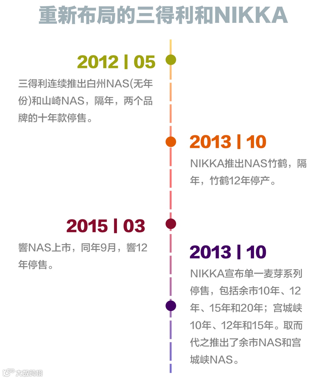 恰恰威士忌是一种需要与时光对话进行沉淀的酒类,只有时间才能赋予其无限魅力。换句话说从制造开始到出售,每一桶酒都要经住时间的考验。这让三得利和NIKKA不得不重新审视目前的威士忌产品线。