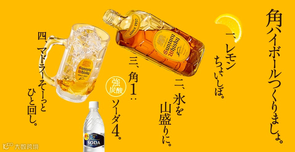 2008年4月,三得利开始把以角瓶+苏打水调制成Highball的这一喝法绑定销售,推出新一轮针对角瓶的宣传活动,形式上无非是洗脑+明星这种常见的广告策略。