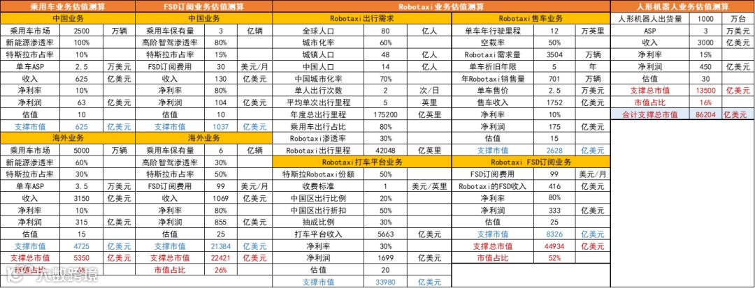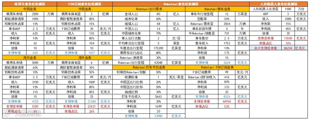 Robotaxi业务:包括类Uber的打车平台,以及相对应的售车+FSD订阅业务。支撑市值45000亿美元,市值占比52%;