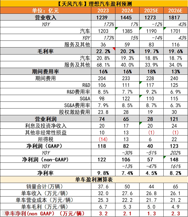 预计26年悲观销量在65-70W,按照19%毛利率对应360亿毛利、240亿费用算,利润120+亿元。悲观看15X对应1800亿的绝对底部,20X对应2400亿,30%空间。