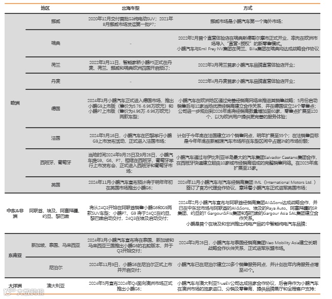 持续加速海外布局,公布“出海2.0”的规划。2024巴黎车展上小鹏汽车表示,已在全球30多个国家和地区开启销售;到2025年底,公司目标为进入全球超过60个国家和地区市场。未来十年,小鹏汽车目标为海外销量占公司总销量的一半。