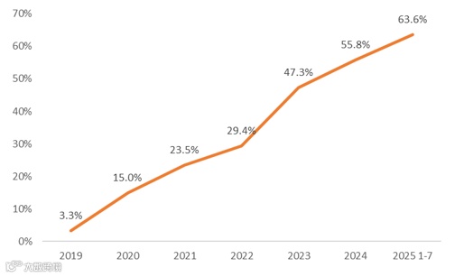 中国L2及以上辅助驾驶渗透率从2019年的3.3%增至2025年前7个月的63.6%。