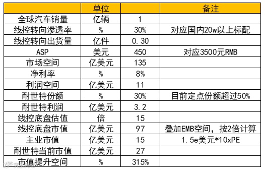 中期线控弹性:按全球1e辆车,线控转向ASP 450美元(3500 RMB),30%渗透率,8%净利率计算。耐世特市占率30%情况下对应3.2e美元利润,15x估值对应50e美元市值空间。叠加EMB,市值空间有望提升至110e美元(较目前超3倍空间)。