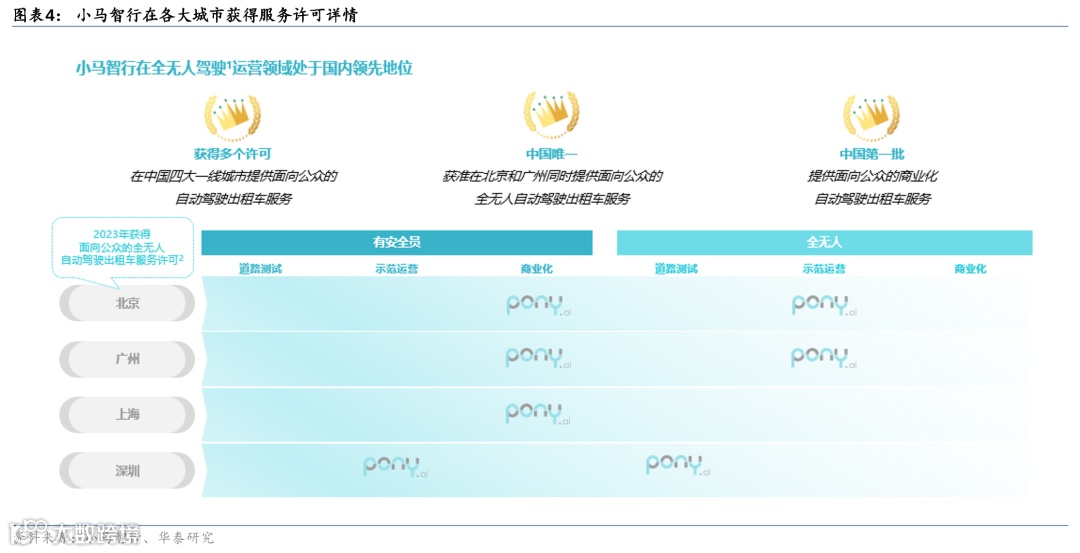 政策支持及牌照获取方面,小马智行处于国内领先地位。能否实现自动驾驶出租车商业落地取决于政策法规、车规级量产能力、以及运营能力三大方面。政策法规方面,目前国内针对Robotaxi的法规,基本上按照城市或城市内不同区域开展立法。当前,小马智行已取得了北京、广州和上海带安全员的商业化牌照,意味着在有安全员的情况下,Robotaxi可以对乘客进行收费。与此相比,深圳目前只颁发示范运营牌照,即Robotaxi可以提供服务,但不能对乘客收费,而公司同样已获得这类深圳牌照。无人驾驶车辆方面,北京和广州已经开始颁发全无人驾驶的示范运营牌照,即乘客可以乘坐全无人驾驶的车辆,但不能收费,公司预计2023年可能会有1-2个城市颁发商业化的全无人驾驶牌照。此外,公司也在上海和深圳争取更多的无人化牌照,小马智行已于2023年5月拿到了深圳颁发的市级道路测试牌照。