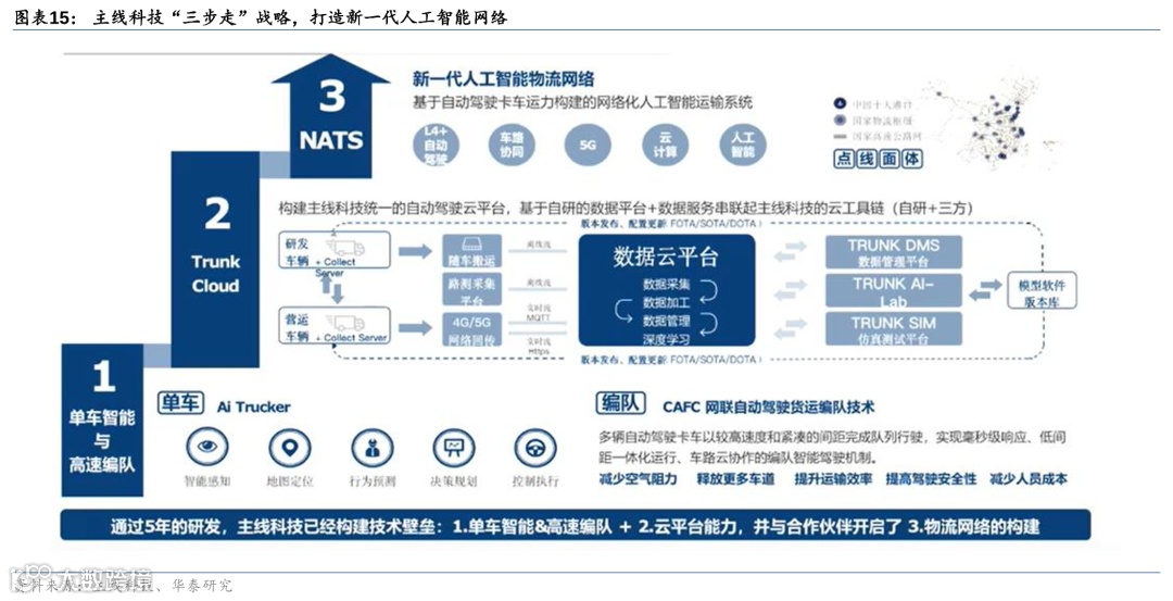 主线科技共计拥有200+专利申请与授权,参与制定多项行业标准,为行业树立标杆。 在“十三五”规划当中,主线科技获得了科技部的唯一一个自动驾驶卡车的项目,以帮助整个自动驾驶的编队和单车的路线设计科研工作。随后在“十四五”规划中,公司再次获得了交通部的第一批先导区试点项目的资格。最近,公司在积极开展无人码头、高速编队以及通港达园项目。通港达园是从港口到上高速,最后到物流园区全流程打通,该项目由天津港、中外运和招商公务联合付费,目标为实现京津路线上的完全常态化商业运营。整体上,主线科技的模式是通过与客户开展合作,并联合主机厂共同定制卡车,实现整体深度合作。
