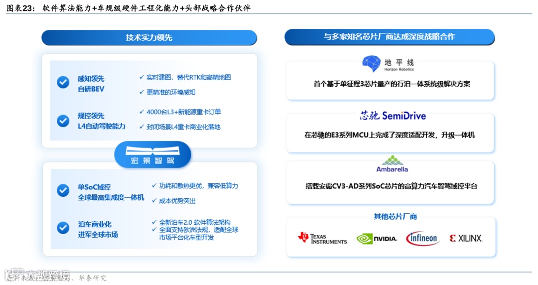 宏景智驾技术方向从高阶智能驾驶解决方案起步,技术栈覆盖硬件、软件及中间件,具备自研能力并自有生产工厂。在辅助驾驶(ADAS)的赛道上,公司快速切入乘用车前装量产市场,与地平线合作基于征程3系列的行泊一体控制器以及800万像素的摄像头。目前宏景智驾在行泊一体领域的市场份额和出货量都位列前三。2023-2024年宏景智驾计划注重性价比,进一步降低成本,深化基础功能,匹配更多的低价位车型。