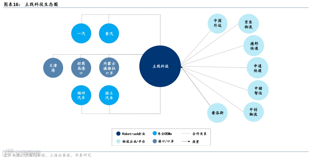 主线科技深耕Robotruck物流运输网络构建,目前已发布针对公路货运、港口、园区等不同场景的多款Robotruck产品,合作卡车制造商包括重汽、一汽、福田和徐工,落地的物流枢纽包括天津港的自动化码头、宁波港、中蒙口岸、京津路线的通港达园等,提供L4商用车自动驾驶运营服务的物流平台包括申通、德邦、中储智运;同时,公司有丰富的相关产业投资人,包括普洛斯、北汽、博世、民航基金等。