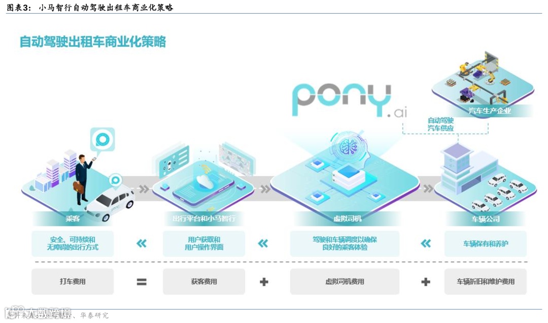 Robotaxi商业化策略兼顾供需两端,未来有望赚取“虚拟司机”的费用。在Robotaxi的商业模式中,小马智行扮演着多重角色,包括同时解决供应端和需求端的问题。供应端方面,小马智行的战略是与车企(OEM,Original Equipment Manufacturer)深度合作,共同量产具有商业化资质和能力的无安全员Robotaxi,并将其投入到网约车平台运营。从需求端看,乘客可通过打开应用(如滴滴、曹操、T3等平台)预约网约车,而公司将赚取虚拟司机这部分的收入。目前,客户支付的费用一部分给应用平台,一部分给司机,还有一部分给车辆保有公司负责车辆的维护。