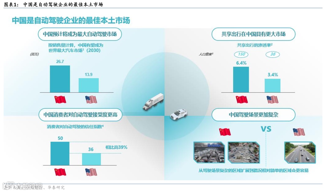 小马“进军中国”的决策主要基于对中国庞大的自动驾驶市场的乐观预期:1)从市场容量角度看,根据小马的讲义,在弗若斯特沙利文报告中提到中国有望成为全球最大的自动驾驶市场,2030年自动驾驶汽车销量有望达到26.7百万辆,远超美国的13.9万辆;2)从共享出行渗透率角度看,中国的高人口密度使得共享出行的“必需性”更高,渗透空间更大;3)从消费者对自动驾驶接受度看,在经历了新能源汽车及网约车等新技术和新场景的普及后,中国市场对于新能源汽车带来的一些新场景的接纳度和适应性普遍较高。上述三点均表明中国自动驾驶领域的发展优势。然而,中国在自动驾驶落地方面也是机会与挑战并存,包含复杂多变的驾驶环境,以及摩托车、三轮车、外卖配送等场景。小马智行凭借多年的数据积累,已能实现无安全员的自动驾驶。这一点既是公司技术实力的证明,也为未来市场的扩展打下了良好的基础。