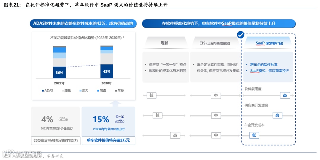 辅助驾驶市场仍处于“春秋战国阶段”,长期视角下,汽车软件重要性凸显。目前在乘用车市场中,智能驾驶产品相对较新,整个行业处于早期阶段,竞争者众多。因此,供应链格局并不像传统的汽车零部件一样定位清晰。在传统汽车零部件的供应链中,OEM、Tier 1、Tier 2的边界和分工都清晰明确,但辅助驾驶市场像处于“春秋战国阶段”,新的产品不断出现,许多主机厂可能也会参与其中,主要玩家均处在摸索阶段。但长期来看,软件在汽车领域的重要性不言而喻。根据罗兰贝格2023年3月发布的《智能汽车软件白皮书》,2022年,每辆汽车的单车软件价值占比约4%,到2030年该占比预计将提升至15%。在软件中,ADAS软件的价值占比也在不断攀升,2021年ADAS软件价值占比约36%,而至2030年ADAS软件价值或上升至43%,在所有整车软件中占比也相对较高。