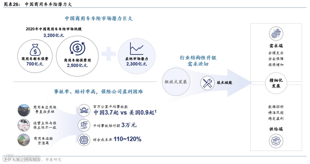 除商用车市场规模外,公司当前重点关注商业模式中的保险市场部分。商用车的保险市场与乘用车的保险市场完全不同,尤其是在中国,商用车保险市场以散户为主,因此安全问题导致了保费市场的乱状。智能驾驶技术可提高车辆的安全水平,从而直接使保险公司受益。