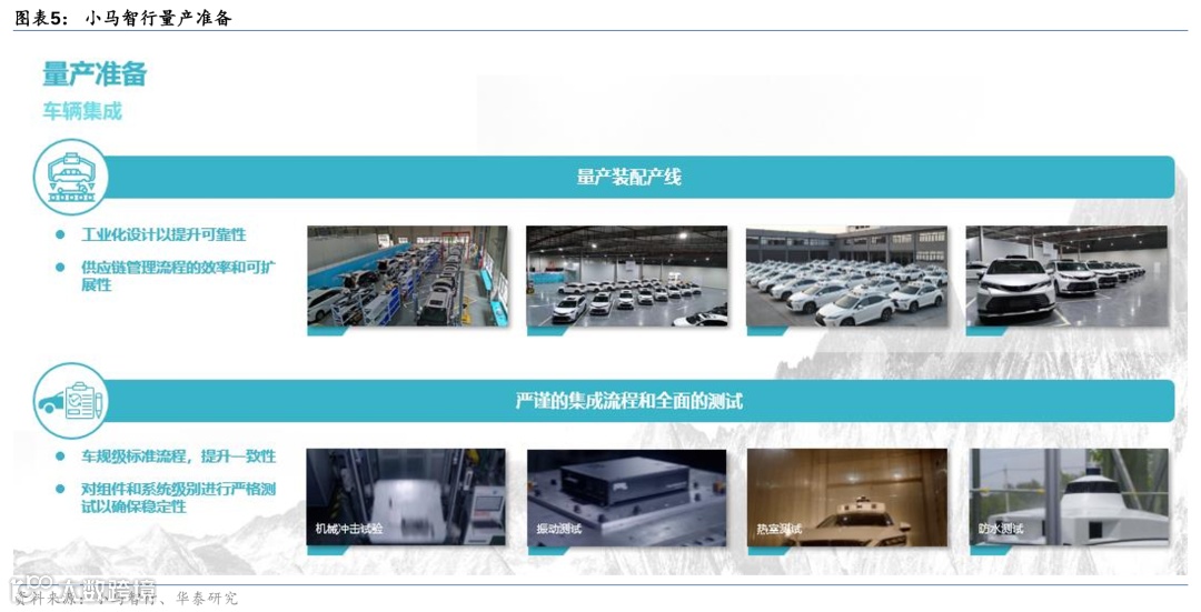 公司在量产方面也蓄势待发,并预计下一代产品将直接在OEM装配线上进行生产。小马智行正专注于量产的准备工作。当前,大部分车辆仍是在手工装配生产线上生产,随着生产规模的扩大,到千辆、万辆级时,生产方式则需转变为全自动生产线。整个生产过程要经过严谨的集成流程,包括集成测试及各项必要的质量测试,如振动测试、热室测试、防水测试等。这些在汽车产业界是标准的生产流程,而若不遵循这些流程,生产出来的L4级别车辆将难以保证车规级别的质量及其生命周期内的质量。小马智行的Robotaxi已在生产线上有所尝试,公司预计下一代产品将会直接在OEM的装配线上进行生产。