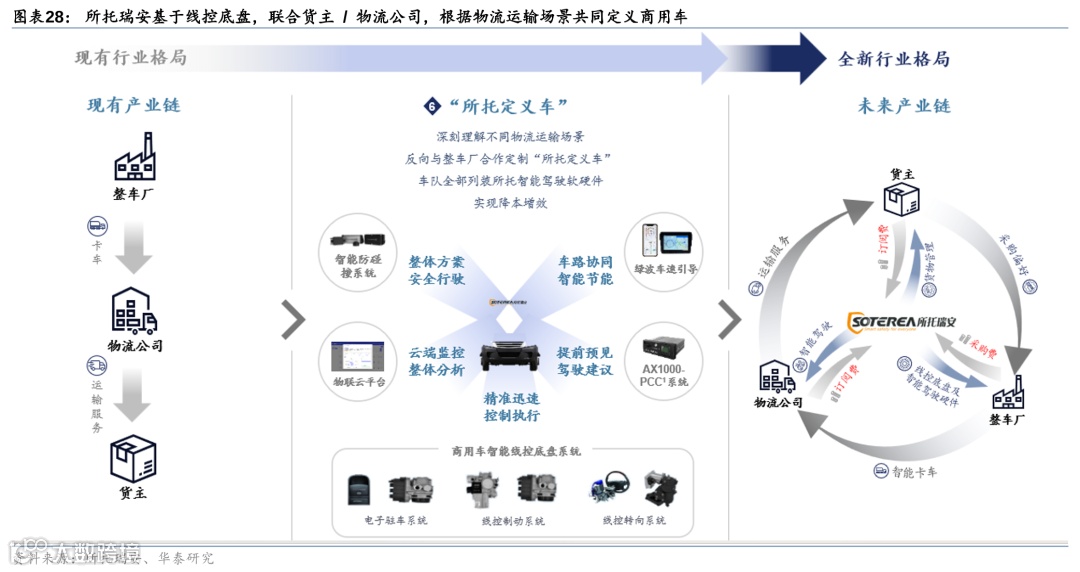 所托瑞安以安全性为切入点,产品覆盖智能安全、智能驾驶、数据平台三大板块。在安全运维服务方面,与保险公司合作积累应用数据,侧重对驾驶员和车辆风险画像。此外,公司着手开发线控底盘,以满足智能驾驶以至更高级别的需求。考虑到存量车辆在市场中的占比较大,所托瑞安与清华大学进行了合作。清华大学在制动系统及底盘等方面是国内领先的高校之一。近年来,所托瑞安与清华大学逐步将这些技术商业化。例如,公司已经与三一公司完成了相关公告,并与其他主机厂展开了合作。