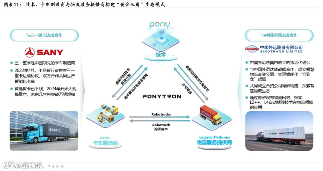 在卡车方面,小马智行主要做干线物流,并在商业化运营中主要考虑供应端和需求端。公司的策略是与三一重卡成立合资公司一骥智卡,而一骥智卡的目标是打造具有L4自动驾驶能力的卡车。该L4自动驾驶卡车将会供应给小马智行与中国外运股份公司(物流服务提供商)一起成立的另一家合资公司,该公司利用一骥智卡的卡车作为运输力量。从整体价值链的角度来看,小马智行的业务包括了车辆制造、运营、数据流管理以及数据迭代。该“黄金三角”生态模式可有效地运营Robotruck业务,为小马智行带来商业收入。