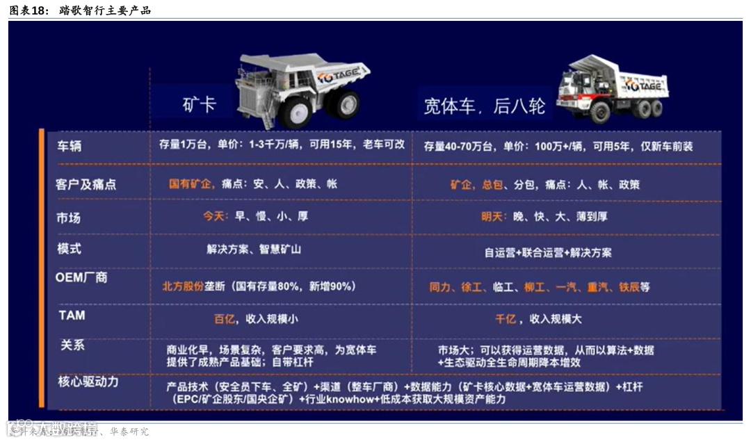 公司定位矿山无人驾驶方案与运输服务提供商,核心竞争力为全栈自研车规级解决方案和国企客户积累。主要客户大型国央企,市占率和复购率均居于行业前列。同时,踏歌具备多种复杂场景下的解决方案,并已成功覆盖包括露天金属矿、煤矿和建材矿等场景,踏歌也是业内首个实现安全员下车的矿山自动驾驶企业。