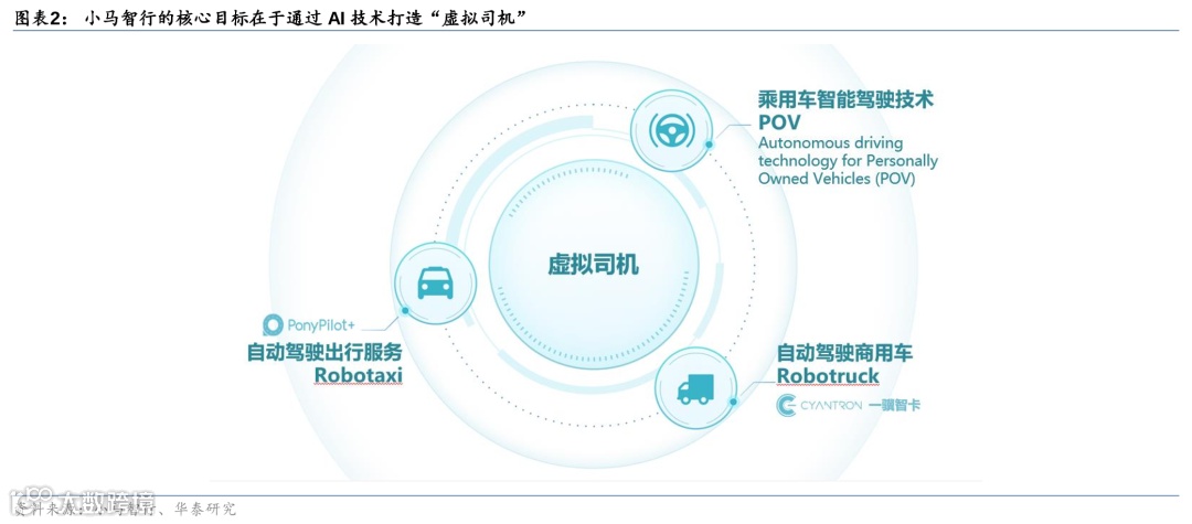 小马智行的核心目标在于通过AI技术打造的“虚拟司机”。虚拟司机可比喻为经验丰富的人类司机,具备驾驶各种车辆类型和适应多种驾驶场景的能力,如城市、高速公路,以及封闭场所。从虚拟驾驶员技术的实际应用来看,小马智行目前主要关注的落地场景分为三大板块,包括Robotaxi、Robotruck以及乘用车:1)Robotaxi是小马智行最早发力的板块,主要鉴于公司认为该领域的市场潜力最大,并可以为社会出行服务带来根本性的变革。通常来讲,在没有安全员的情况下,乘客最初会较为焦虑,但在乘车过程中会逐渐感觉到虚拟司机的熟练度和安全性后就会逐渐放松。当前在北京和广州已经有乘客经常性地选择小马智行作为其出行方式,且注册用户中约有75%是重复用户;2)2018年开始,小马智行逐渐进入Robotruck,即干线物流领域,主要受到虚拟驾驶员技术进步,以及公司对于市场规模和需求的判断等因素驱动。干线物流市场中大多数的司机年龄偏高,而很多年轻人更愿意从事外卖行业,因此公司认为未来几年内干线物流司机的需求或会出现较大的缺口。目前,Robotruck 业务仍需配备安全员;3)从2020年开始,小马智行也逐渐考虑将其虚拟司机技术应用到乘用车中,通过Tier 1的方式赋能主机厂,并成立了“Personally Owned Vehicles”,简称POV。在乘用车领域,小马智行将提供基于L2+或者是Advanced ADAS的解决方案,包括硬件和软件。