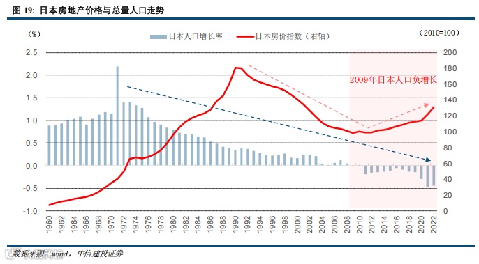 2009 年总人口进入负增长之后,日本反而在 2013 年迎来房价上行。人口规模决定的是房地产市场规模大小,但作为买卖双方博弈得出的价格,不必然跟随市场规模缩小而持续下行。