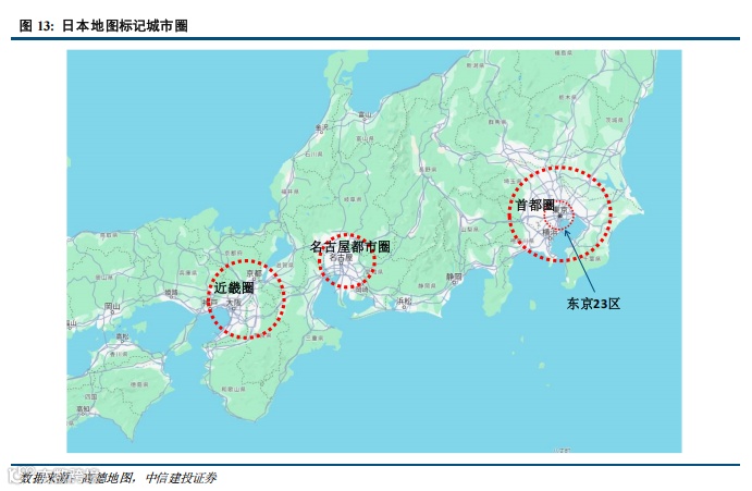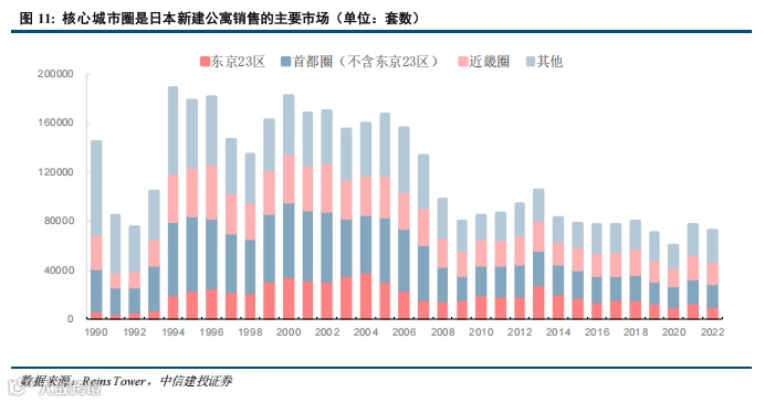 核心城市圈房地产交易量占比迅速提升。1990 年,东京 23 区新建公寓销量占首都圈的比重仅为 17.4 %,1996 年以后,这一比重基本上都超过 3 成。2013 年日本房价开始反弹,东京 23 区的销量占比超过一半。