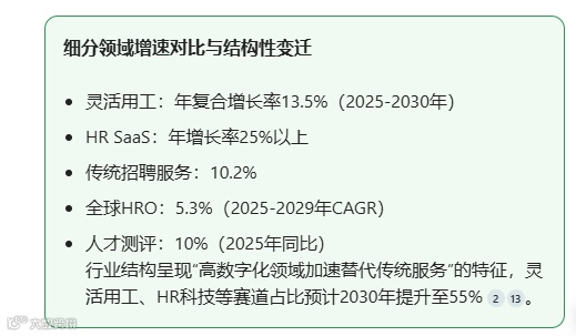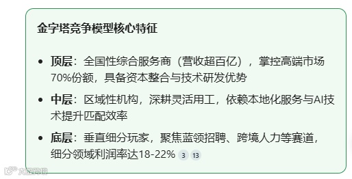 从市场结构看,外资与本土龙头在高端市场形成直接竞争,而互联网平台型企业与科技公司通过AI、大数据切入灵活用工与招聘领域,形成跨界冲击。具备全国服务网络、数据积累能力的头部企业持续获得资本青睐,垂直细分赛道如蓝领招聘、跨境人力资源服务等亦展现高成长性。