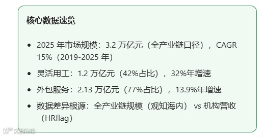 采用全产业链市场规模统计口径,涵盖人力资源服务各环节的整体交易规模,因此得出 2025 年 3.2 万亿元的市场规模数据。 - HRflag