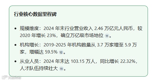 则以行业机构营收为统计标准,2024 年行业营业收入已突破 2.46 万亿元,较 2020 年增长 23%,该口径更侧重反映服务机构的经营成果。