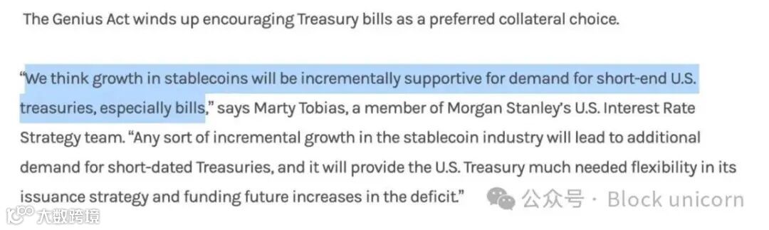 甚至摩根士丹利认为稳定币是一个增量投资机会。值得注意的是,这些代币的成长可能会提振对短期美国国债的需求,从而使财政部在弥补赤字和管理现金流方面拥有更大的弹性。这些代币能够实现大额结算,例如银行间转帐或贸易结算,几乎可以即时清算,其运作方式类似于数字现金帐户。
