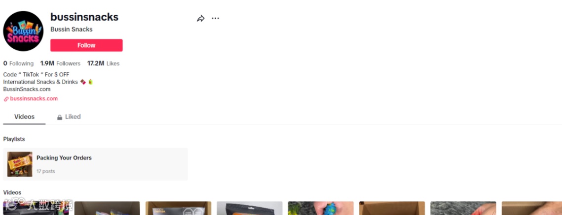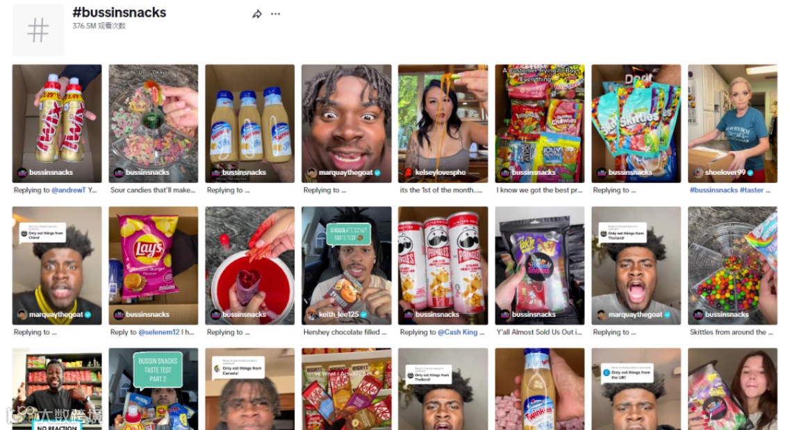 Bussin Snacks主要拍摄开箱视频,测评零食,其次善用话题标签,TikTok上的品牌话题#bussinsnacks拥有3亿多的阅读量。提高了在TikTok上的展现量和关注度。