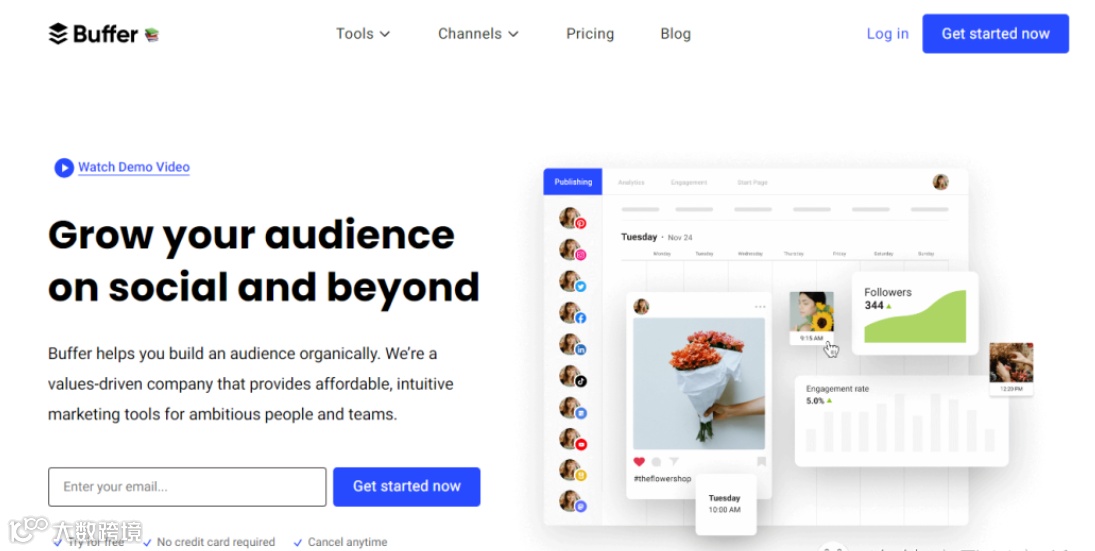Buffer是一种社交媒体管理工具,能够安排社交媒体内容,创建图像,测量结果。可以定时发布Facebook帖子,还具备跟踪功能。